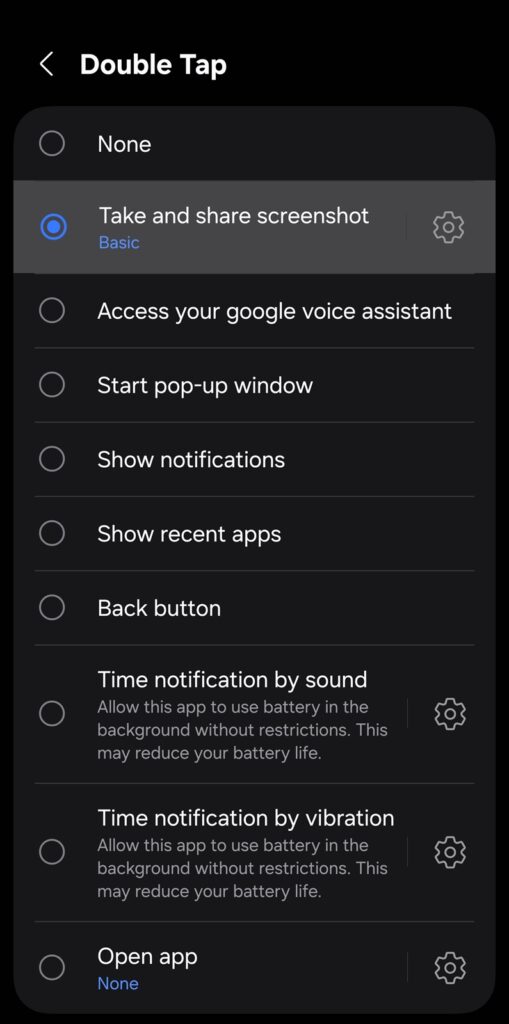 3. Go to Double Tap and select Take and share screenshot β€”Β you can further customize the action from the Gear icon next to this option (Basic gives you the regular screenshot menu after capturing the screen, while Share pulls up the full share sheet so you can instantly share your screenshot)
