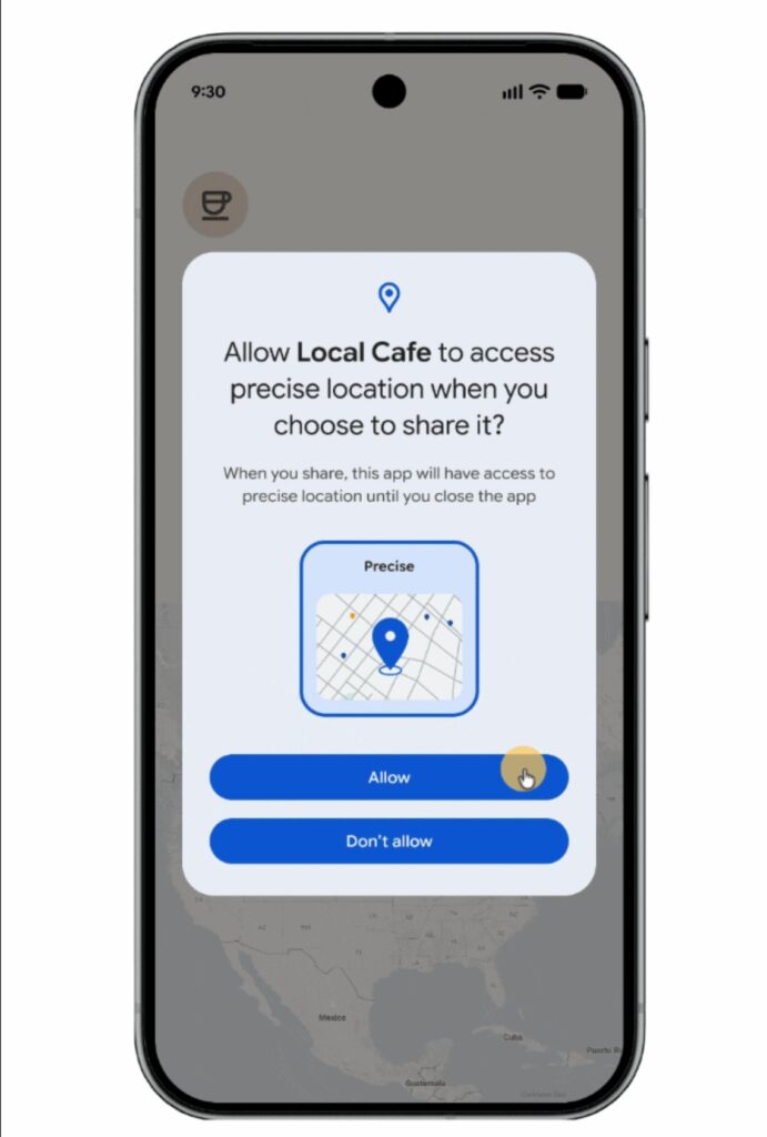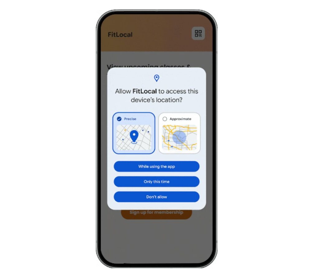 The update also improves the location runtime permission dialog. The dialog shows two options: Precise and Approximate, letting you understand the difference before giving access. This helps you take the most informed privacy decisions with less friction.