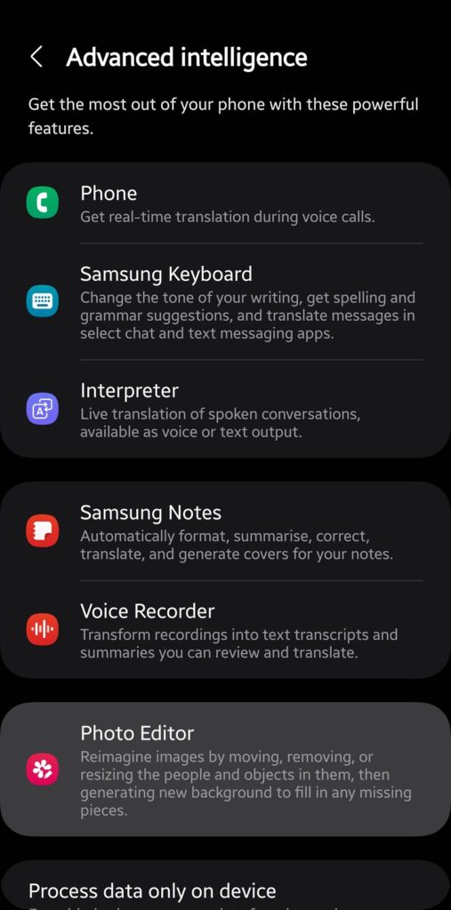 All supported Galaxy AI features for your device are listed on the Advanced intelligence page. You can individually enable/disable the tools. Generative edit, aka Photo Editor, is automatically disabled if you turn on on-device processing. You must allow cloud-based processing to use this AI-powered photo editing tool. Your phone will prompt you to change the settings when trying to use the tool in the Gallery app. So, you can easily switch between the two settings as needed.