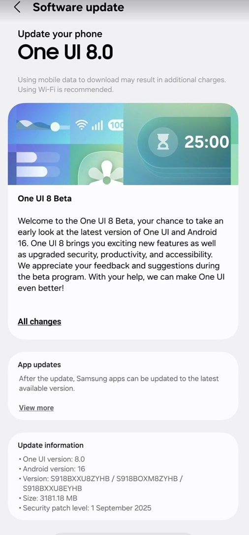 The initial beta release for the Galaxy 23 series carries firmware version ZYHB, with the OTA package weighing over 3GB. It’s the same build that Samsung recently rolled out to the Galaxy S24, S25, Fold 6, and Flip 6, suggesting a synchronized development. The September security patch is part of the package, but the update is more about new features and enhancements.