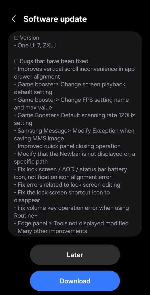 The latest update comes with the firmware build number ZXLJ. It weighs around 1.3GB for the Galaxy S24 Ultra and brings a bunch of bug fixes and improvements. The official release notes mention improvements for the vertical app drawer, Game Booster, Samsung Messages, Quick Panel, Now Bar, lock screen, edge panel, and more. You can check out the full changelog below.