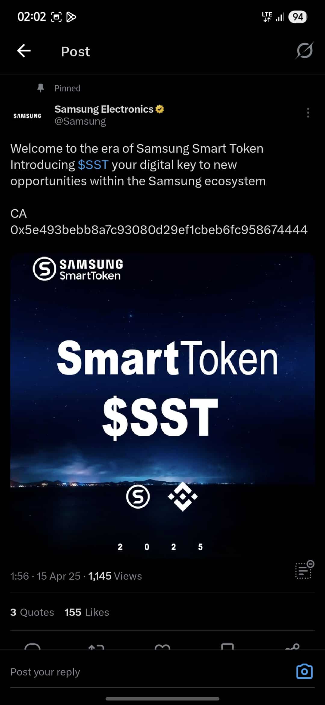 Around 3:00–3:15 PM EST on April 14, Samsung’s official X (formerly Twitter) account was hacked. One of the posts (now retracted) claimed that $SST is a new Web3 token you can earn by walking with your Galaxy Watch, using SmartThings automation, or Galaxy AI. They even dropped a crypto wallet address and name-dropped Samsung Wallet and Knox to make it look legit.