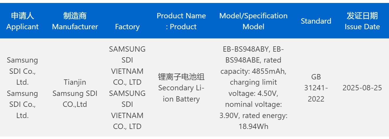 China Quality Certification Center recently certified a Samsung battery with model numbers EB-BS948ABY and EB-BS948ABE. These cells are intended for the upcoming Galaxy S26 Ultra (SM-S948). The listing reveals a rated capacity of 4,855mAh, identical to that of the S25 Ultra. As usual, this will be marketed as a 5,000mAh unit, marking the seventh consecutive generation of Samsung flagships to retain the same battery capacity.