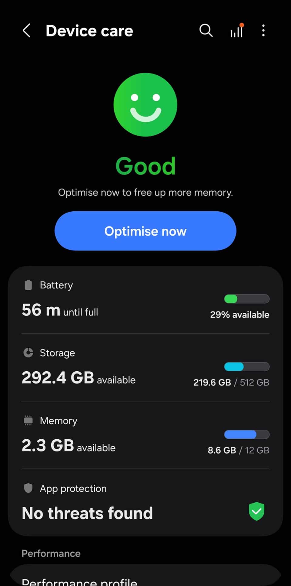 Likewise, the Device Care page now sports a simplified, more visual layout. Instead of simply showing how much storage or memory is available, it now highlights the percentage of used space. These metrics are paired with larger, more prominent bars that make the current status easier to grasp at a glance. The result is less clutter and a more intuitive way of presenting data.