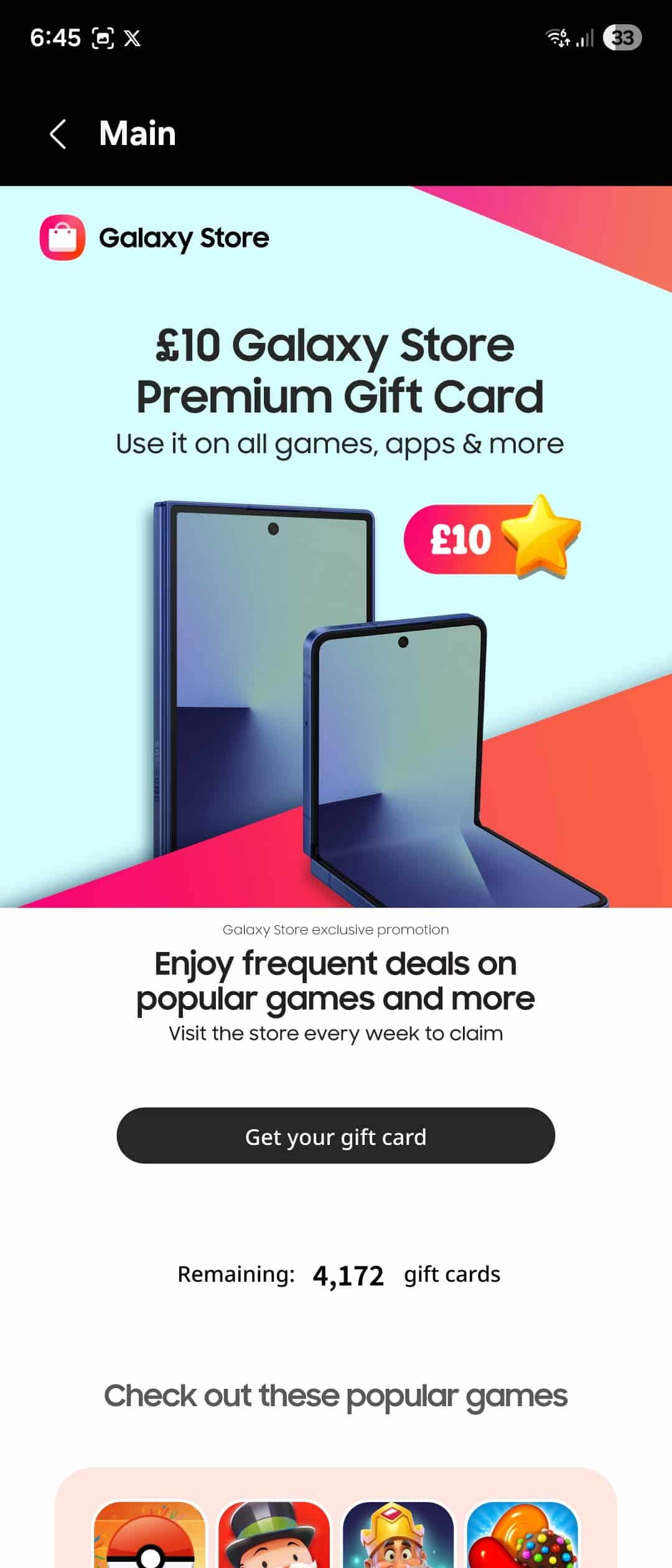 Getting your hands on this credit is pretty simple. You might receive a push notification from the Galaxy Store app that directs you straight to the redemption page. If you don’t see a notification, just open the Galaxy Store app and look for the little gift icon in the top-right corner of the homepage. Tap it, then hit Get your gift card and the £10 will be added to your account.