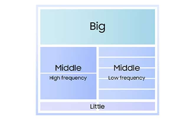 At the core of the Exynos 2500 is a deca-core CPU in a 1+7+2 arrangement. Arm’s Cortex-X925 “big” core leads the line, running at a peak frequency of 3.3GHz. It is supported by two Cortex-A725 middle cores at 2.74GHz, five more Cortex-A725 middle cores at 2.36GHz, and two Cortex-A520 small cores at 1.8GHz. Samsung claims a 15% improvement in performance over the Exynos 2400.