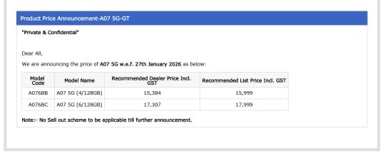According to tipster Abhishek Yadav, Samsung plans to launch the Galaxy A07 5G in India in two configurations. The base variant with 4GB RAM and 128GB storage is priced at ₹15,999 (approx. $175), while the higher-end model with 6GB RAM and 128GB storage is expected to retail for ₹17,999 (approx. $199). The tipster seemingly obtained the info from Samsung’s internal communication with retail partners, so the figures are likely accurate.