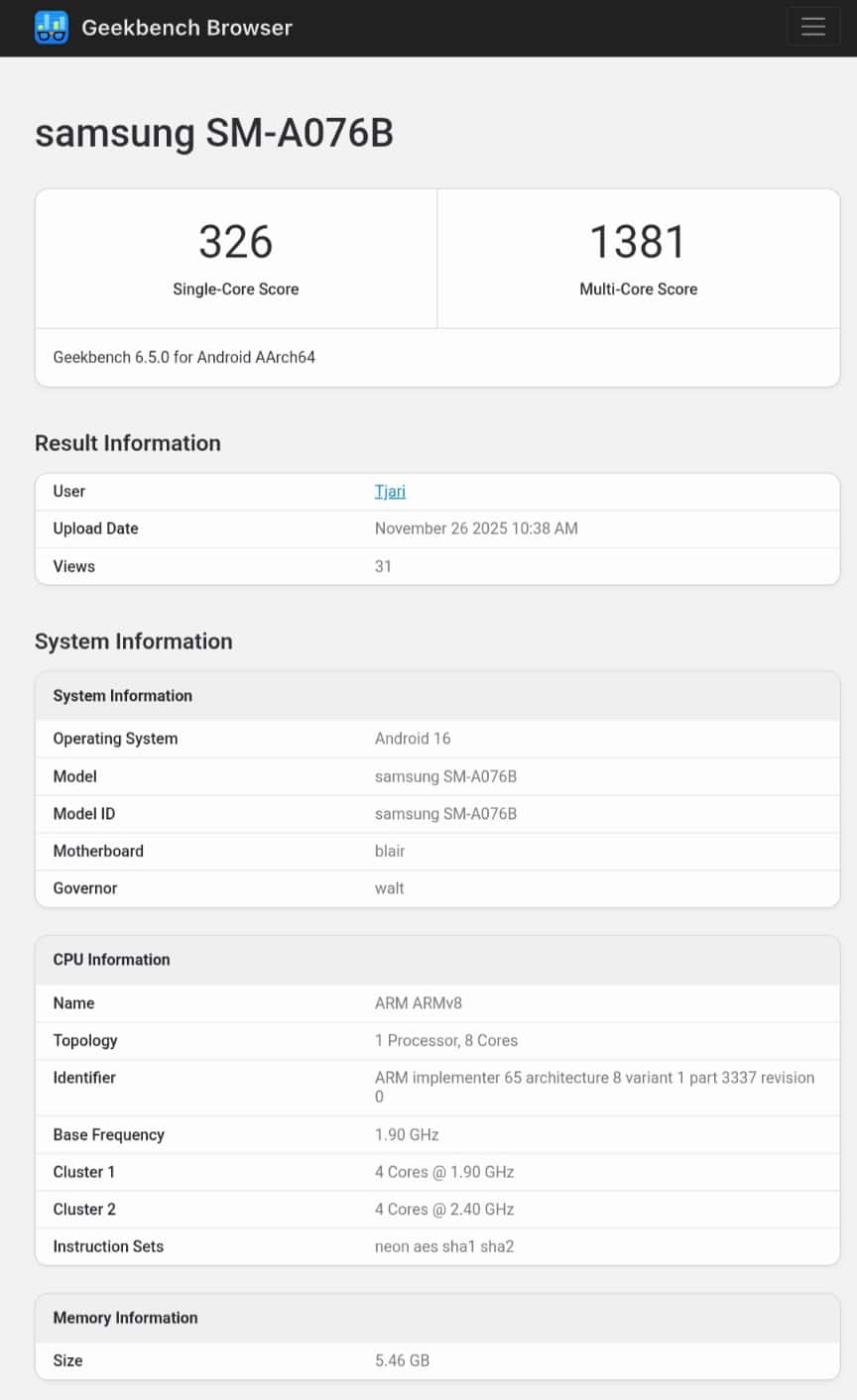 The Galaxy A07 5G also appeared on Geekbench with an Adreno 610 GPU and 6GB RAM. It is running Android 16. The device scored 326 in the single-core test and 1381 in the multi-core test, which feels quite lower than expected. For comparison, the Galaxy A06 5G usually scores over 700 in single-core and around 2000 in multi-core. It is possible that this particular listing was tested under poor conditions, which often results in lower scores. Future listings should give a clearer picture of its actual performance.