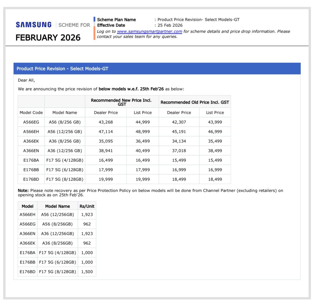 According to a leaked internal document, the Galaxy A56’s 8GB + 256GB model sees a price increase of INR 1,000, from INR 43,999 to INR 44,999. The 12GB + 256GB variant now costs INR 48,999, up from INR 46,999 (an increase of INR 2,000).