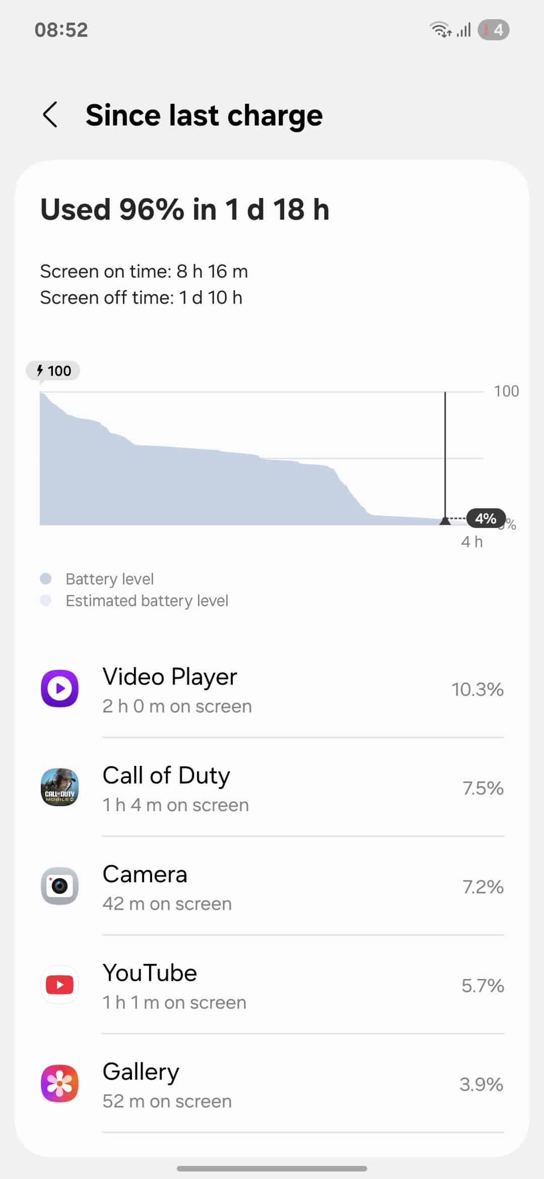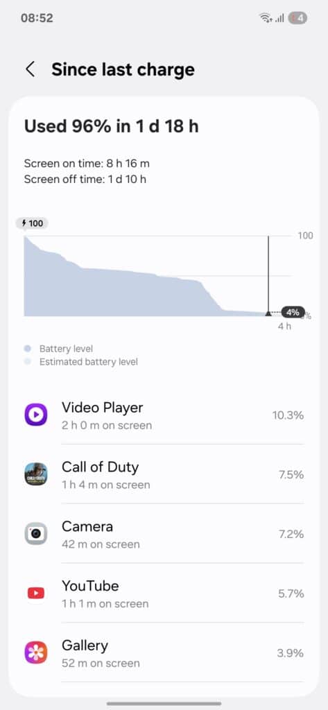 As you can see in the screenshot below, the Galaxy A56 gave more than 8 hours of screen-on time from a full charge down to 4%. That’s a pretty impressive result for a large-screen device — 2 hours of video playback on the default player consumed just 10.3% of the battery, while 1 hour of gaming used about 7.5%.