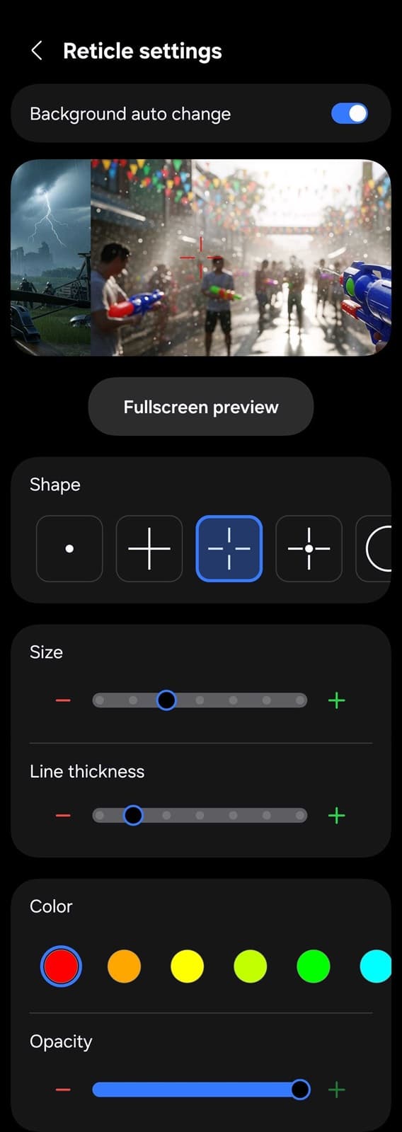 The latter, meanwhile, is a new addition to Game Booster+. The new Aim Assist menu lets you fully personalize the reticle (crosshair) used as your aiming point in shooting games. You can choose from nine different shapes and further tweak the size, thickness, color, and opacity to match your preferences.