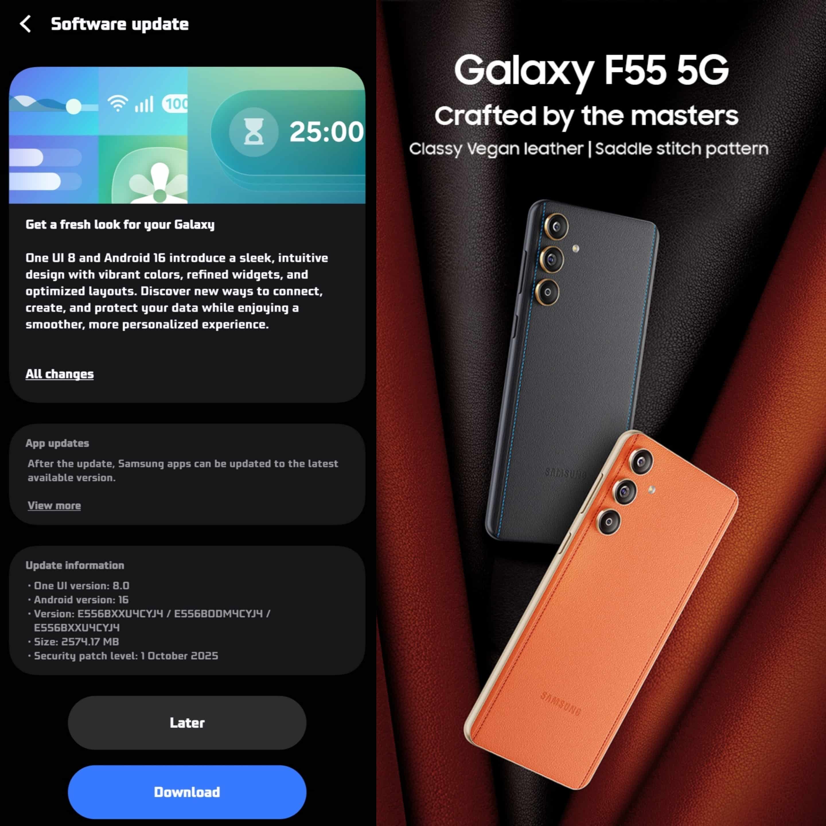 The Galaxy M55s has started receiving the One UI 8 update, based on Android 16, in India. The update carries the October 2025 Security Patch and has an update size of around 2.56GB. It has a build number of M558BXXU2CYJ4.
