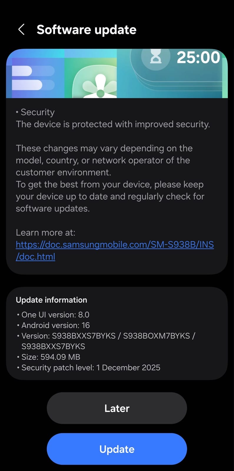 The December 2025 security update for the Galaxy S25 series carries the build version BYKS in most global markets, though it may vary in some regions (it’s BYKG in Korea). The OTA file size also varies depending on the model and region, but expect it to weigh around 600MB. The package contains more than 60 vulnerability fixes, including a few critical Android OS patches.