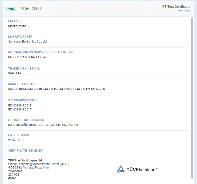 According to the TUV listing, the Galaxy S25 FE (SM-S731) will support 10V/4.5A or 15V/3A wired fast charging, which translates to 45W. In comparison, last year’s Galaxy S24 FE only supported 25W, so this is undoubtedly a welcome upgrade. Notably, both the standard Galaxy S25 and the slimmer Galaxy S25 Edge feature 25W charging. This year, the Korean firm will offer the same fast charging for the Fan Edition as the most expensive Ultra model.