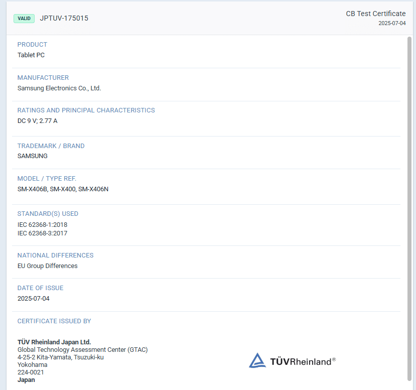 Speaking of the affordable Android tablet, both the cellular and Wi-Fi variants of the Galaxy Tab S10 Lite will support 25W (9V/2.77A) charging, according to the TUV listing. While other models in the lineup — including the Galaxy Tab S10+, Tab S10 Ultra, Tab S10 FE, and Tab S10 FE+ — all come with 45W charging, this is understandable given that the Lite variant is a toned-down version. However, there is still some confusion, as the FCC listing recently suggested that the upcoming tablet might support 45W charging. Hopefully, things will get clearer soon.