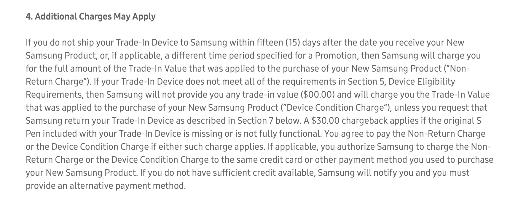 Samsung’s trade-in agreement includes a clause stating that a $30 chargeback applies if the original S Pen included with your trade-in device is missing or not fully functional. This means you must physically include the S Pen when you send in your device, and it needs to work properly. If it is damaged or non-functional, the surcharge can still apply.