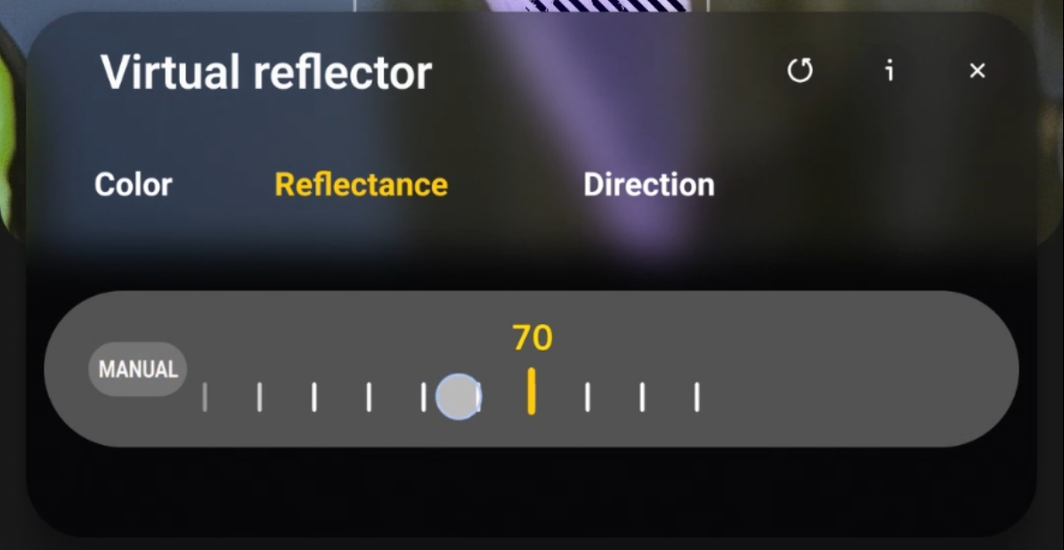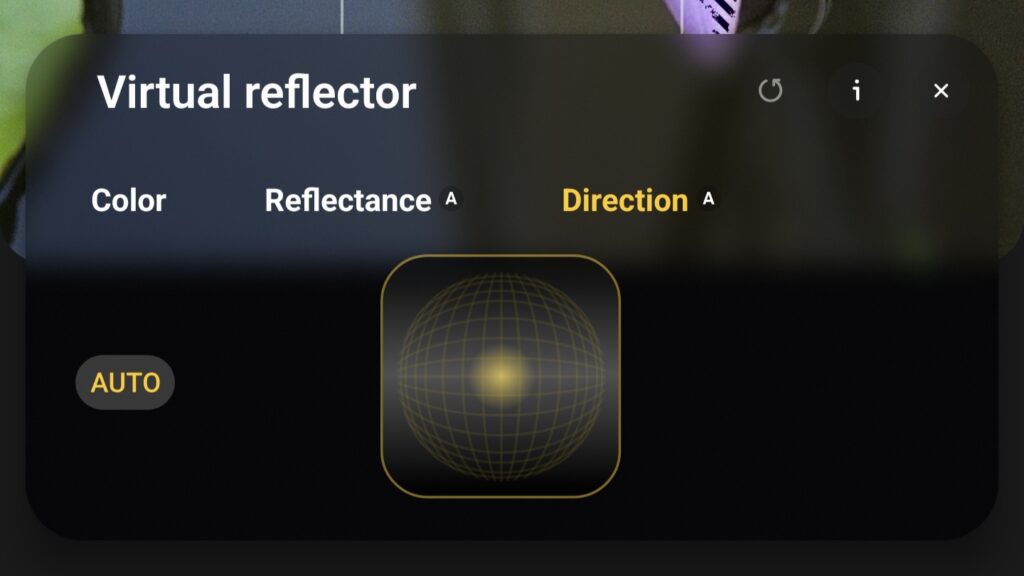 Both options replicate real studio reflector behavior, but through computational processing instead of physical equipment. Virtual Reflector also includes two adjustable parameters: Reflectance and Direction.