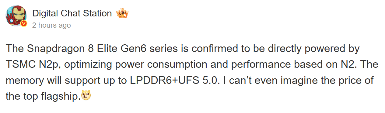 Built on TSMC’s N3P (3nm), Qualcomm’s latest flagship chip, the Snapdragon 8 Elite Gen 5, already delivers incredible power efficiency and performance. While there had been speculation that next year’s Snapdragon 8 Elite Gen 6 will use TSMC’s 2nm node, we didn’t know which specific version of the technology Qualcomm will choose. Noted tipster Digital Chat Station (via Jukan) finally clears that up.