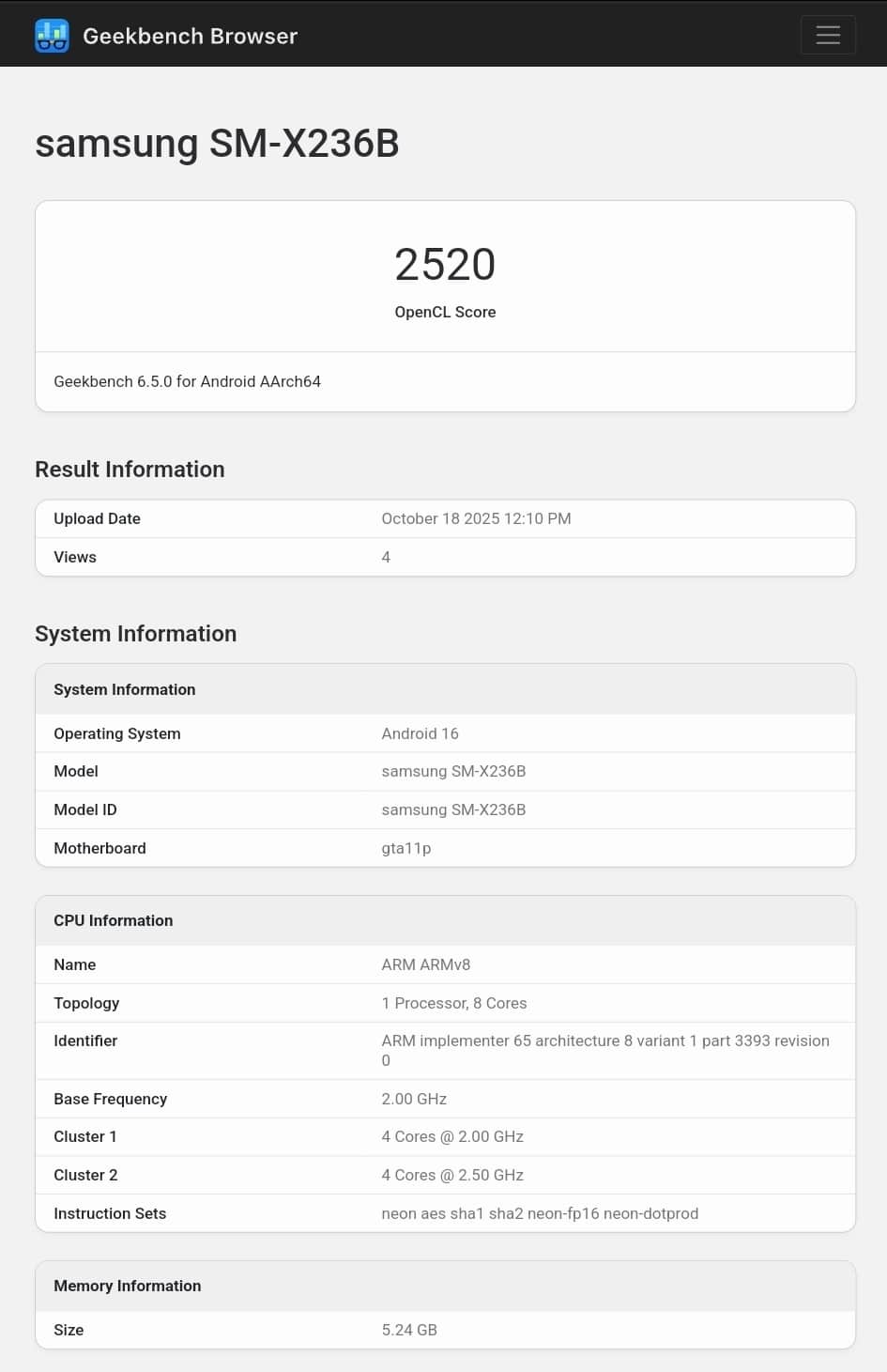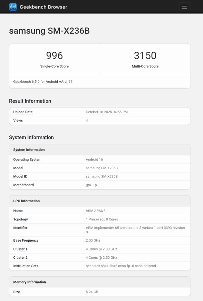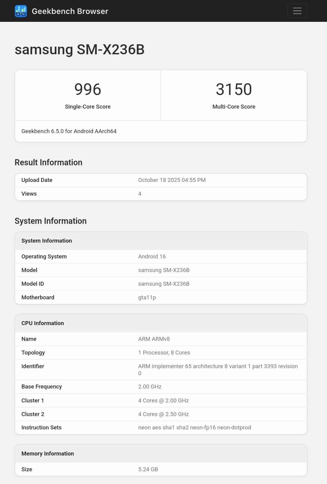 The Galaxy Tab A11+ packs a Dimensity 7300 chipset inside, at least according to the Geekbench listing, which is an improvement over the Qualcomm Snapdragon 695 found in the Galaxy Tab A9+. In the latest Geekbench listing, the Galaxy Tab A11+ (SM-X236B) recorded a single-core score of 996 and a multi-core score of 3150. The build version that the device is running is X236BXXU1AYIF, based on Android 16.