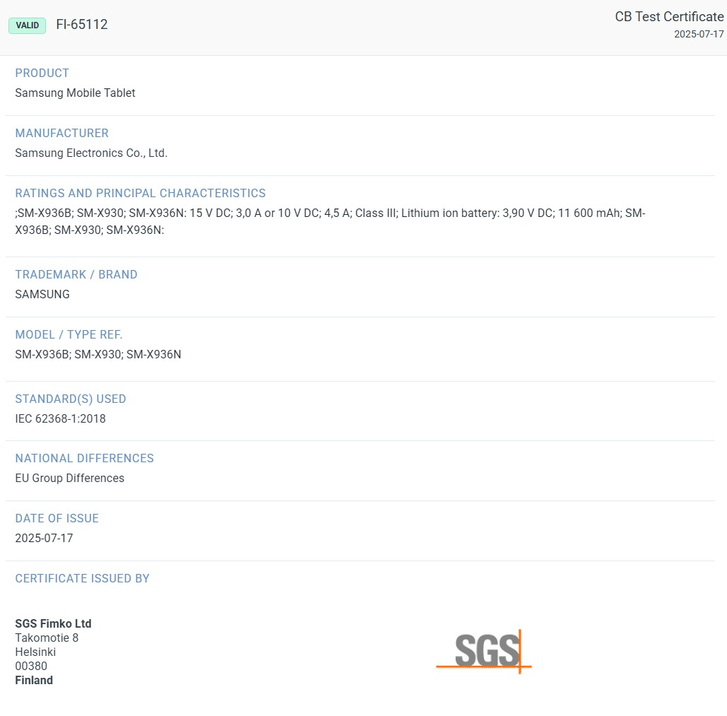 Samsung’s upcoming flagship Android tablet, the Galaxy Tab S11 Ultra, has been making a lot of headlines in recent weeks. Just a few days ago, leaked official renders and live photos gave us our first look at the device’s design. Now, we also have information about its battery capacity and charging speed, thanks to a recent SGS Fimko certification listing.