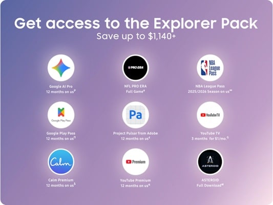 You can now purchase the Galaxy XR through Samsung’s official website. If you pre-reserved the headset, Samsung offers a $100 credit, dropping the effective price to $1,699. But that’s not it, when it comes to freebies. Customers who purchase the device before December 31, 2025, will receive an Explorer Pack at no additional cost. The bundle, valued at over $1,140, includes premium app subscriptions, entertainment content, and productivity tools. Here’s everything included in the offer: