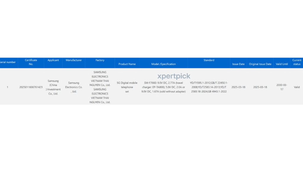 According to the certification documents spotted by XpertPick, the Chinese certification agency tested the Galaxy Z Fold 7 (SM-F9660) and Galaxy Z Flip 7 (SM-F7660) using Samsung’s EP-TA800 charger. This charger supports a maximum power output of 25W (9V/2.77A).