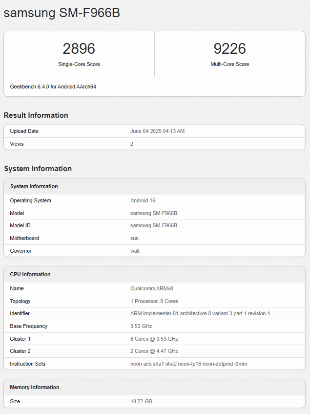 In a newly surfaced Geekbench listing, the global version of the Galaxy Z Fold 7 (model number SM-F966B) posted impressive results. It achieved a single-core score of 2,896 and a multi-core score of 9,226. These numbers are on par with the Galaxy S25 Ultra, confirming that Samsung’s next foldable is ready to compete in the Ultra-tier arena when it comes to raw performance.