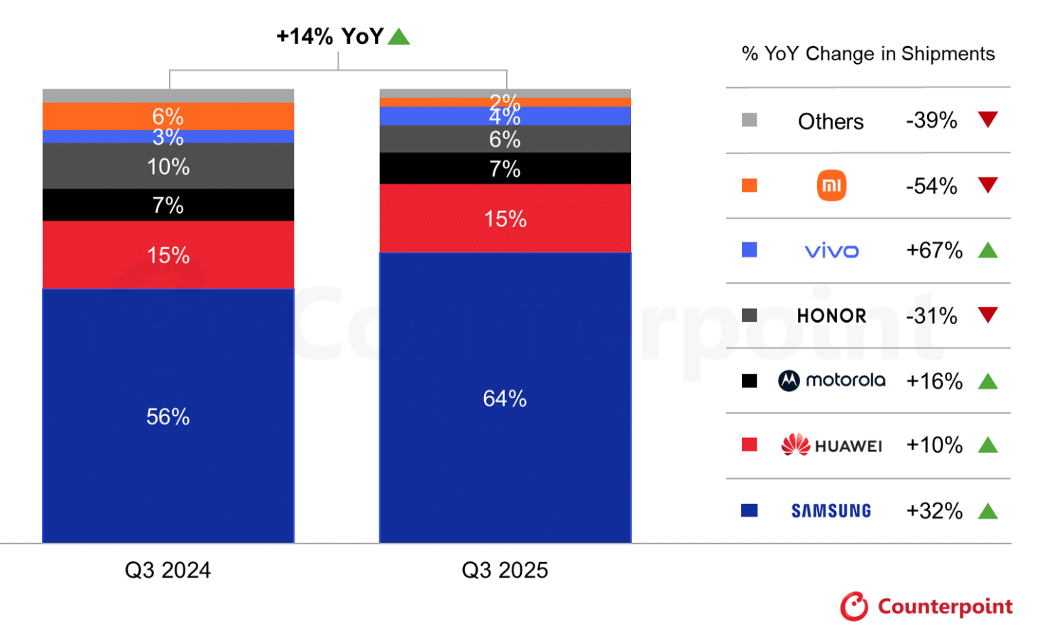 According to Counterpoint Research, global foldable smartphone shipments increased 14% year over year in Q3 2025. It represents the highest quarterly volume to date for the category. On top of that, foldables now share 2.5% of all smartphone shipments. This shows that while they are still a niche product, adoption is steadily growing, mainly in the premium segment.