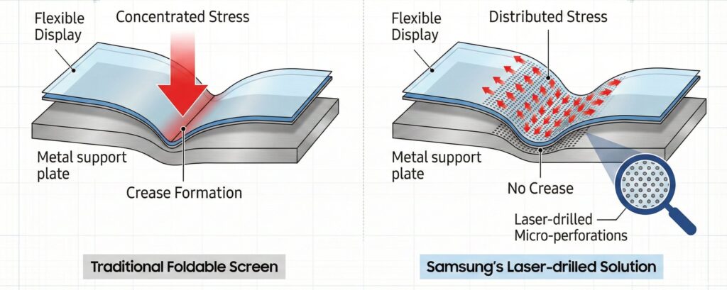 Foldable screens usually develop a crease because all the bending stress is concentrated along a single fold line. Every time the display is closed, pressure builds up in that same narrow area, eventually deforming the materials and making the crease visible. Samsung’s new OLED panel changes how that stress behaves by adding a laser-perforated metal support layer beneath the display, replacing traditional plastic-based supports.