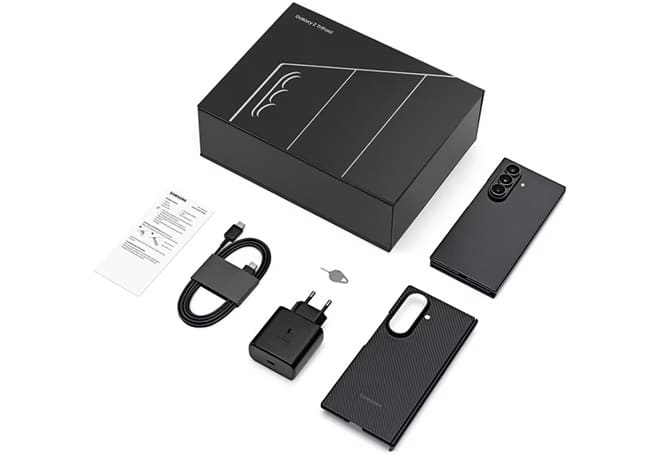 Interestingly, while Samsung is stepping back from S Pen support, it is adding something customers haven’t seen in years: a charger inside the box. The Galaxy Z TriFold ships in a noticeably larger, more premium-looking package compared to the thin boxes of other modern Galaxy phones. Inside, you’ll find the handset itself, along with a 45W fast charger, USB-C to USB-C cable, and even a protective case with a carbon-fiber texture.