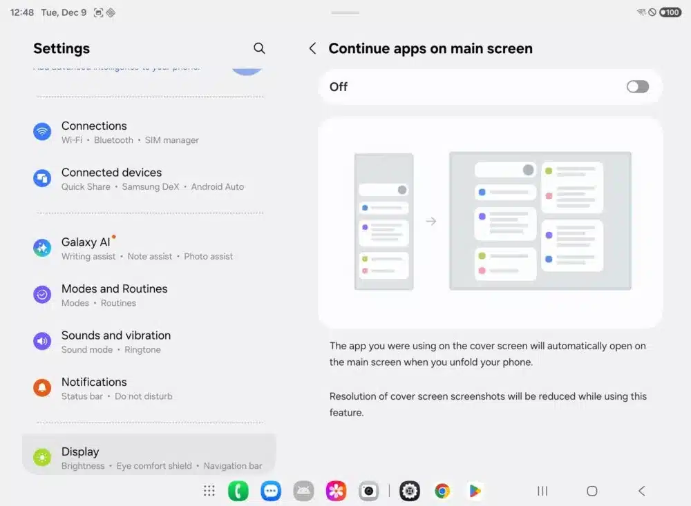 However, with the Galaxy Z TriFold, things work a little differently. The TriFold has a more complex folding mechanism, with two hinges and three screen sections. This creates a problem with App Continuity (you can enable it via Settings > Display > Continue apps on main screen). Samsung mentions that the “resolution of cover screen screenshots will be reduced while using this feature.”