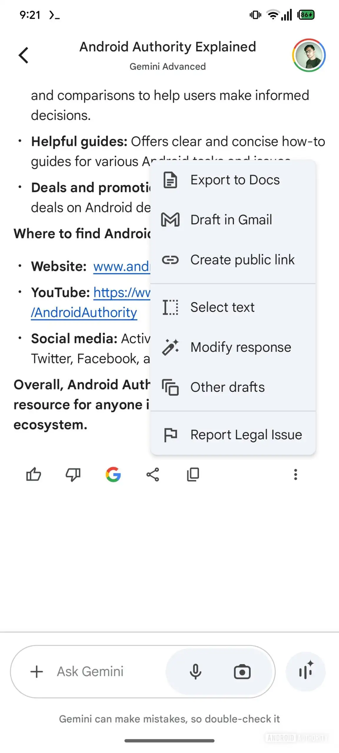 Right now, when you launch the Gemini app, you’re likely to be overwhelmed by the options available. To put this into perspective, long-pressing on a response opens options like exporting to Docs or creating a public link, while the three-dot menu gives you choices to modify the response or select text. While these options are useful, having them in different menus can be confusing. It’s not always clear where to go for a specific action, which generally slows down the user experience. But Google might have a plan to fix this.