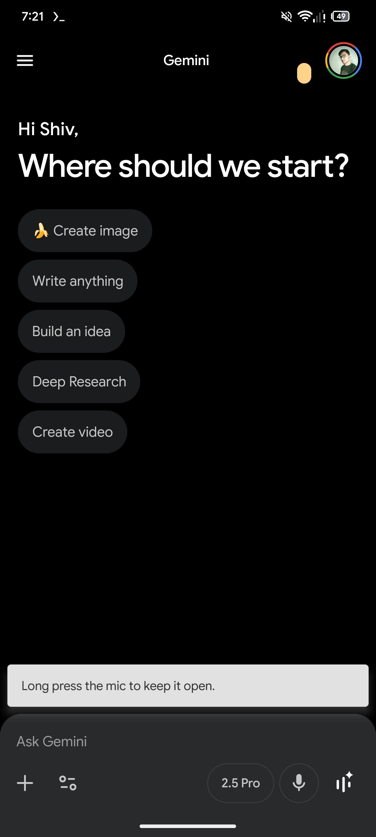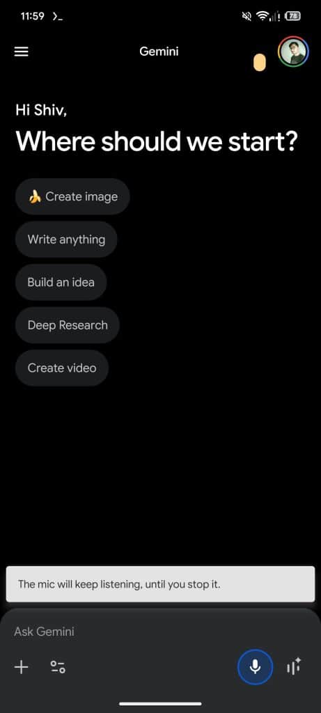 In another screenshot, we read, “The mic will keep listening, until you stop it.” The icon turns into a stop button, which stops recording when tapped. This works like voice notes in messaging apps, letting users pause and speak naturally without rushing. It’s designed for longer requests where Gemini might otherwise interrupt before the user finishes.