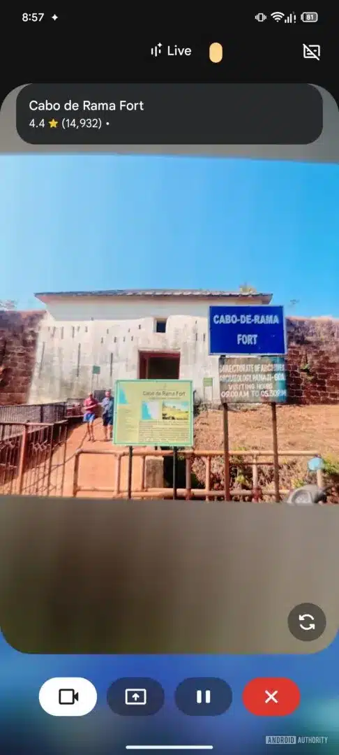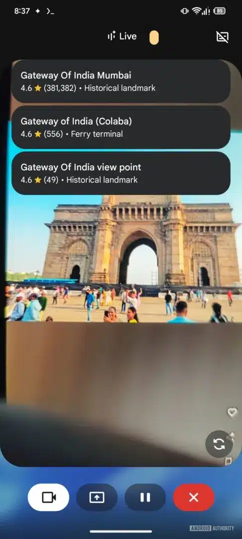 With Gemini Live, you can share your phone camera during a conversation with Gemini AI. This allows the assistant to see exactly what you are seeing in your surroundings. For example, you can point the camera at a historical landmark and get some information about it. It looks like the company now wants to display location information right on the viewfinder in the form of cards.