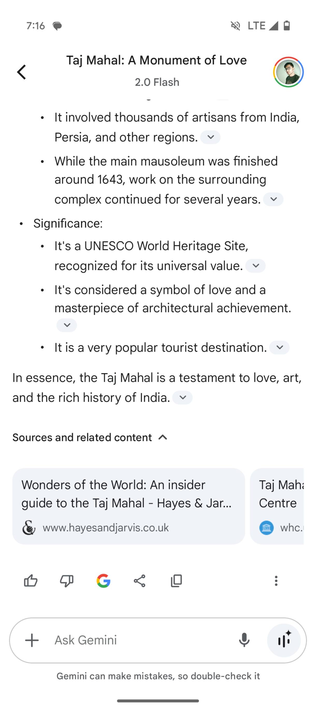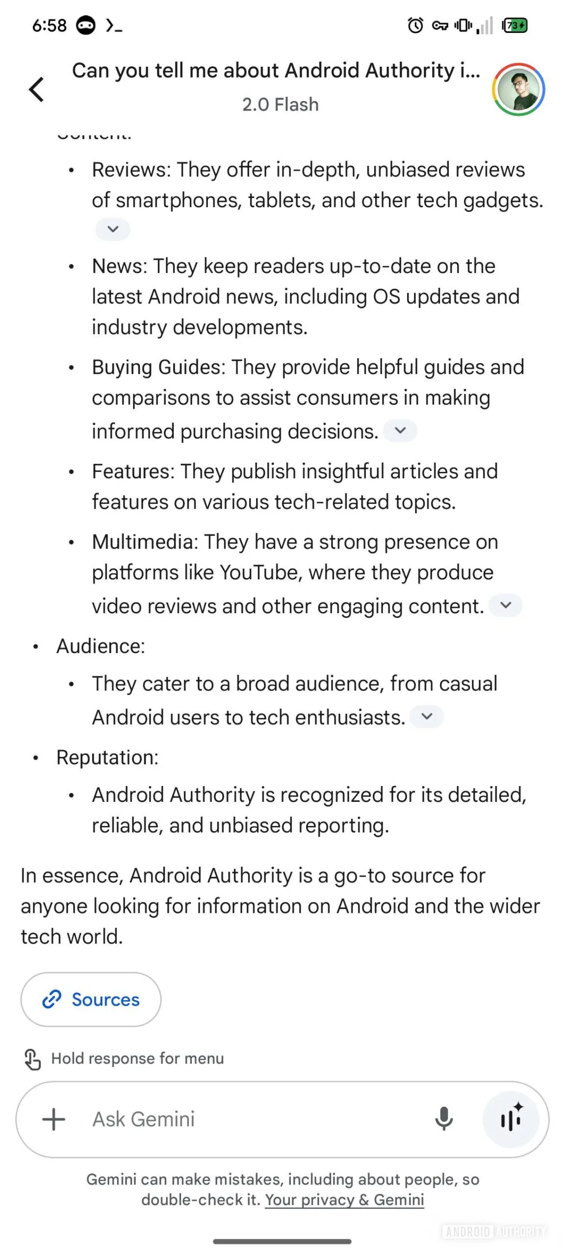 Right now, when you Gemini something, it provides a detailed answer based on the topic. Below the response on Gemini, there’s a horizontally scrollable list showing sources and related content. It works well for now, but ChatGPT handles this better. Unlike Gemini, ChatGPT has a “Sources” chip under the message. Tapping on which brings up a vertical list of links, which is easier to read.