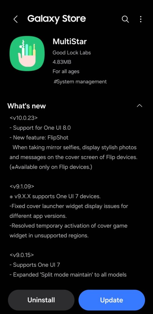 MultiStar, meanwhile, is getting an update to version 10.0.23 with One UI 8 support. It introduces a new feature called FlipShot on the Z Flip lineup. When you’re using the rear cameras on your Galaxy Z Flip to snap a mirror selfie — with the cover screen facing the mirror — FlipShot kicks things up a notch. It lets you display a stylish photo or personalized message on that tiny front display while you’re taking the shot.