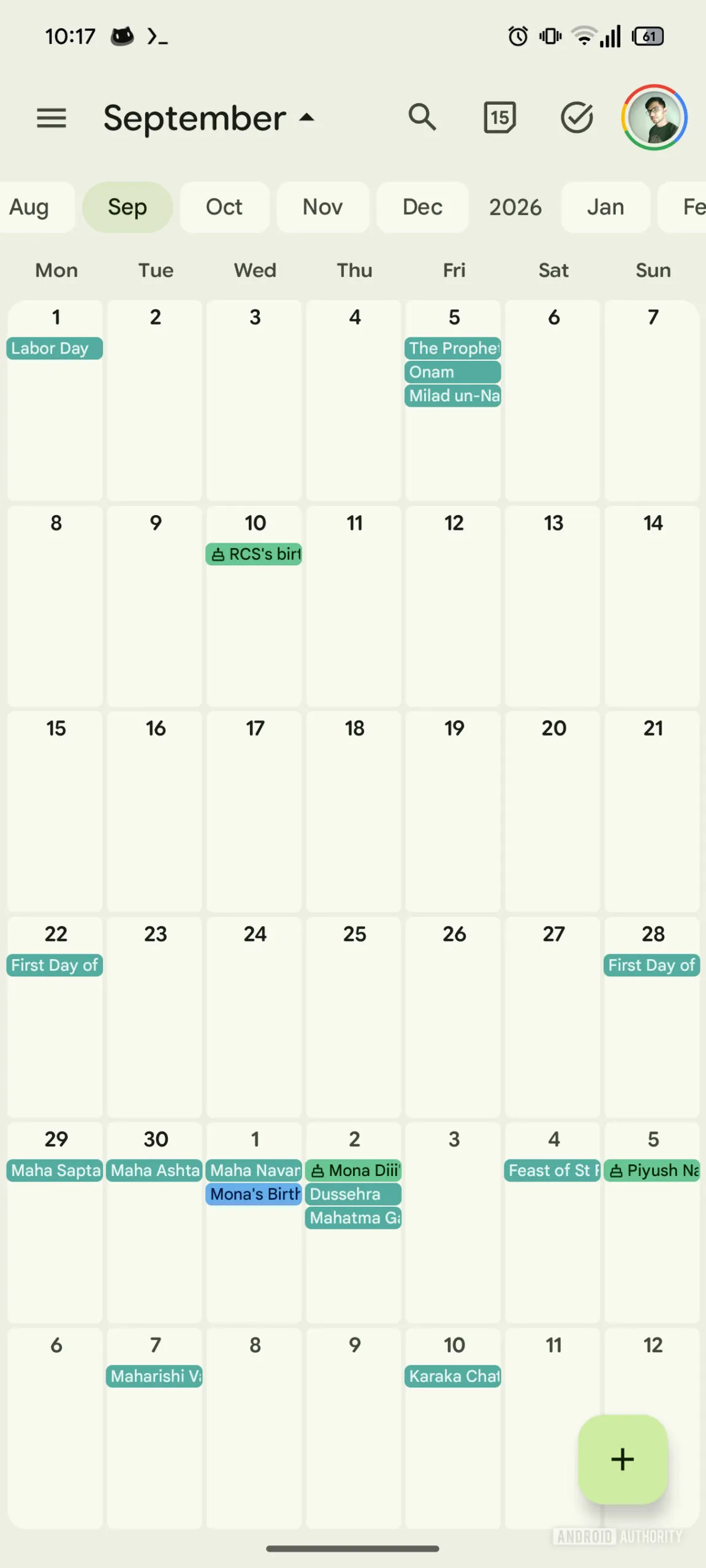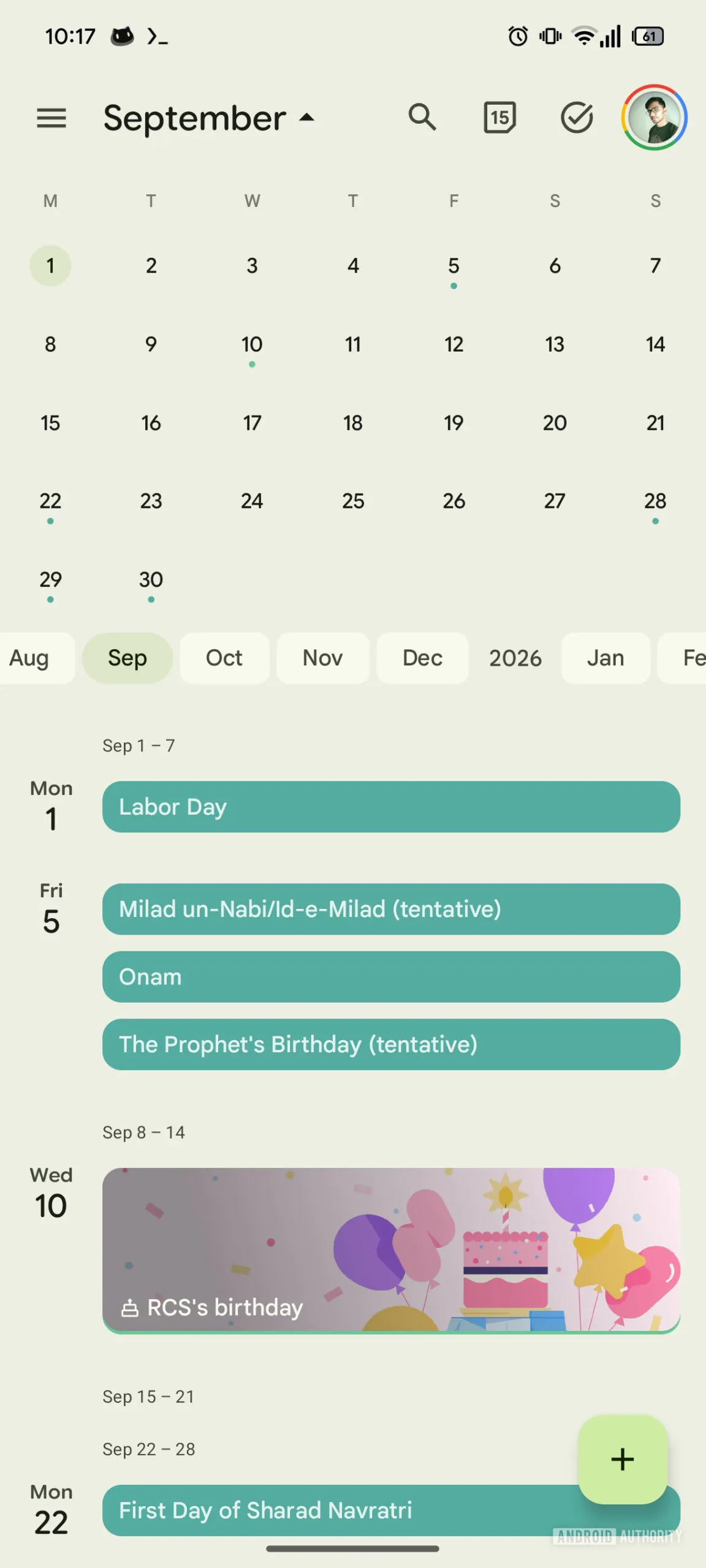One of the more noticeable updates is the redesigned Floating Action Button (FAB). Previously, tapping it brought up options to add an Event or a Task. In the updated version, a Birthday option has been added, along with an X icon to quickly close the menu.