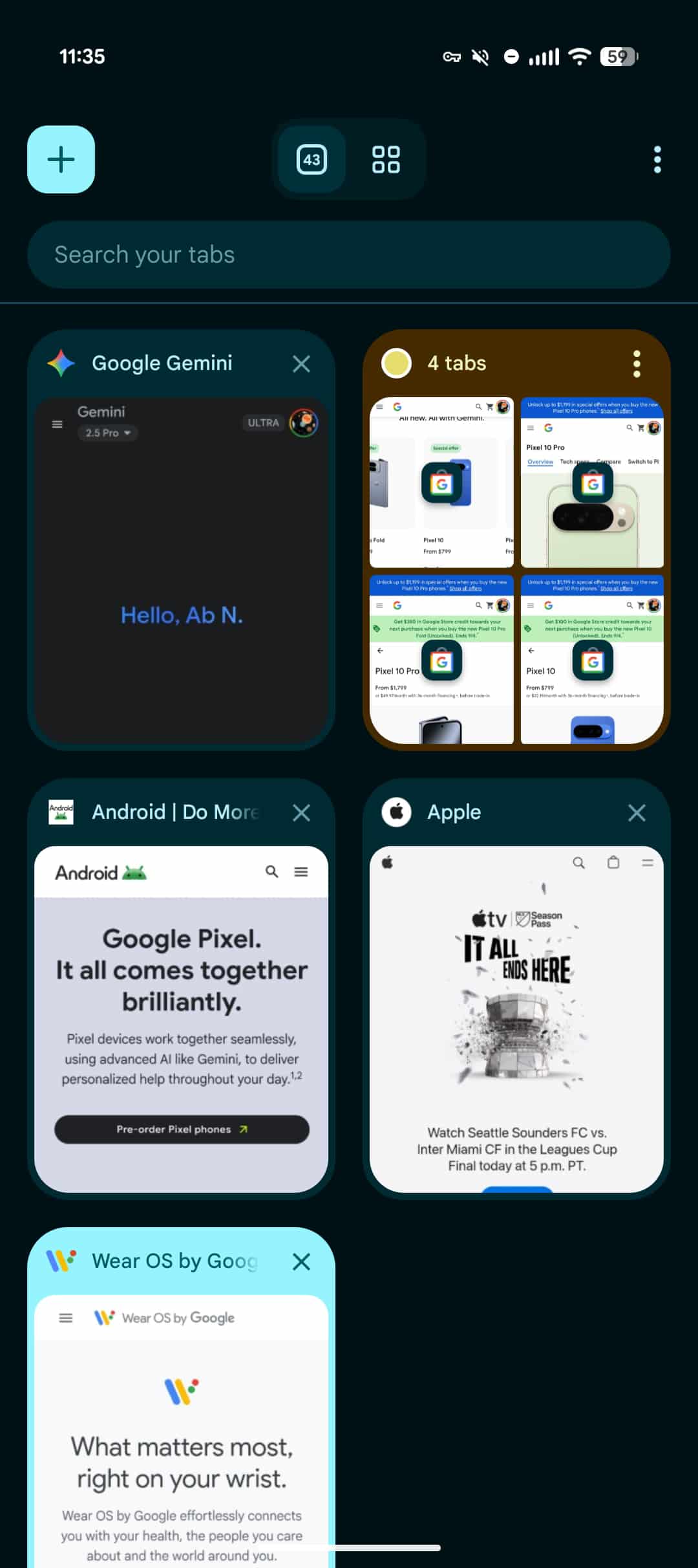 The tab switcher has received a touch-up as well. The familiar grid now places the “new tab” button inside its own square container, with Incognito and tab group controls following the same style. Tab Groups themselves have been slightly reworked. Earlier builds used solid-colored cards, while newer versions either highlight the outline or fill the group card with the chosen color, depending on the release.
