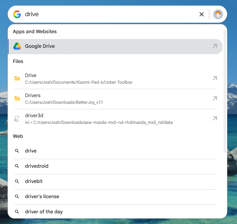 Here, you can search for numerous things, both locally and on the web. In addition to your typical Google web searches, you can scan for locally stored files, install apps, visit commonly used websites, and anything stored in your Google Drive. There’s also an AI Mode and AI Overviews here too.