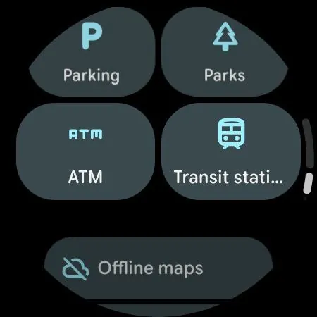 The interface leans heavily on teal accents, matching the Google Maps mobile app and adding a refreshing splash of color to the watch experience. Recent places appear as a clean list with updated card styles, while a grid of popular categories sits below for quick access.