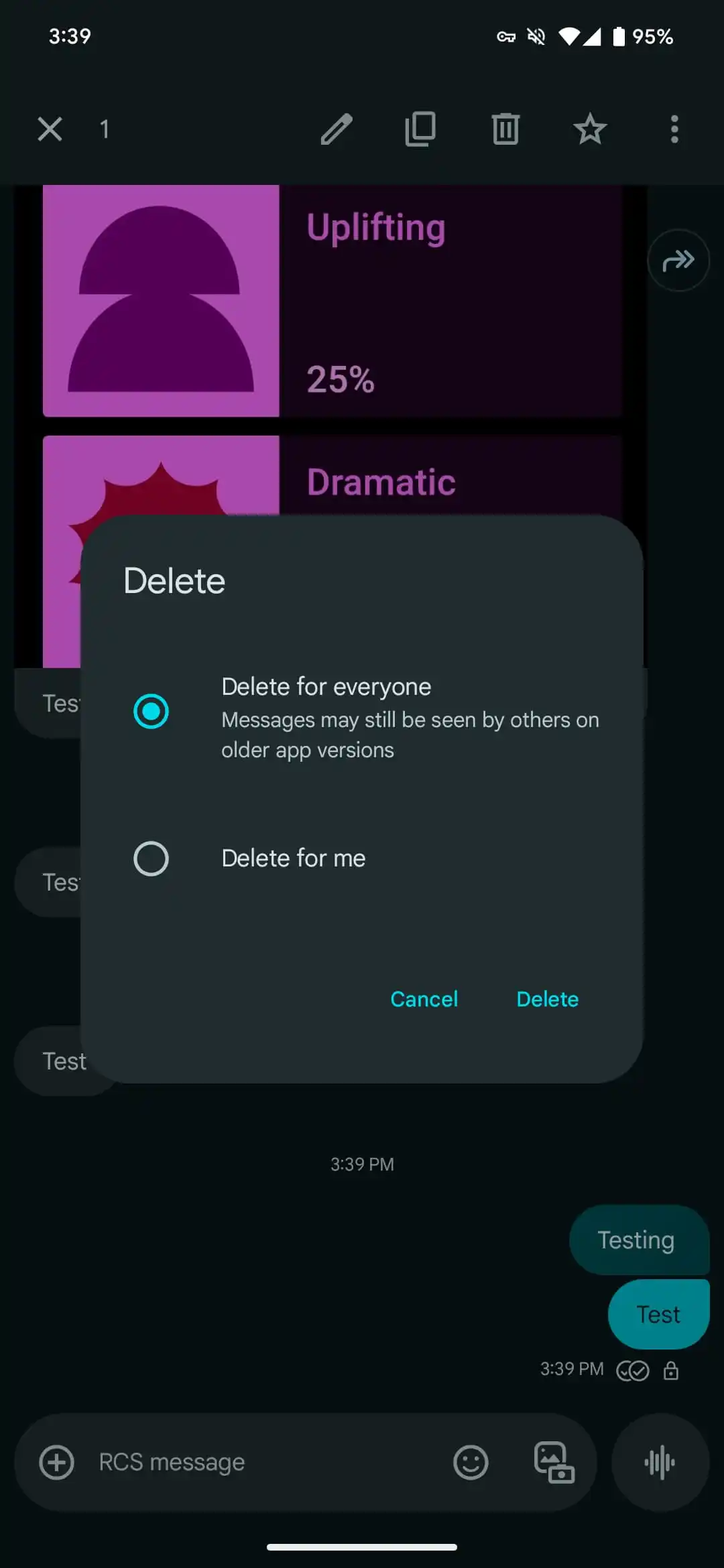 Another useful addition is the ability to delete messages from the chat threads, just like Telegram and WhatsApp. When you are in an RCS conversation, you can initiate the Delete for everyone and Delete for me options by just long-pressing a sent message. This will allow you to either delete the message from your side or retract it for the recipient. Keep an eye out for the latest Google Messages app update in the Play Store.