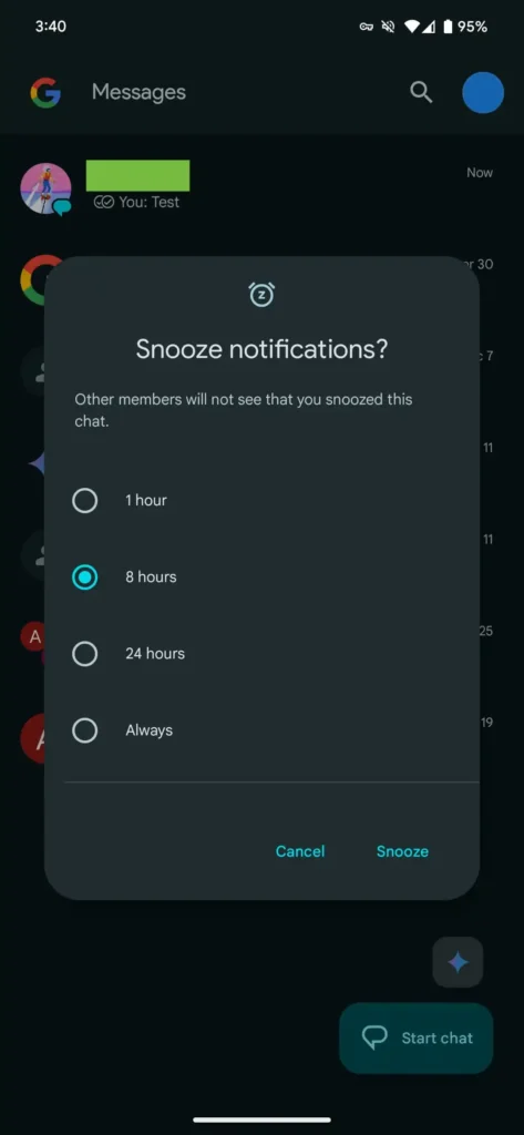 The most notable addition is the Snooze notifications that let you control messages seamlessly. You can now mute notifications for any chat for a certain period. This is particularly helpful if you want to check the notification at a more convenient time. To access, just long-press on a chat from the main screen, and you will see the Snooze notifications panel. You can choose from four options: 1 hour, 8 hours, 24 hours, and Always.