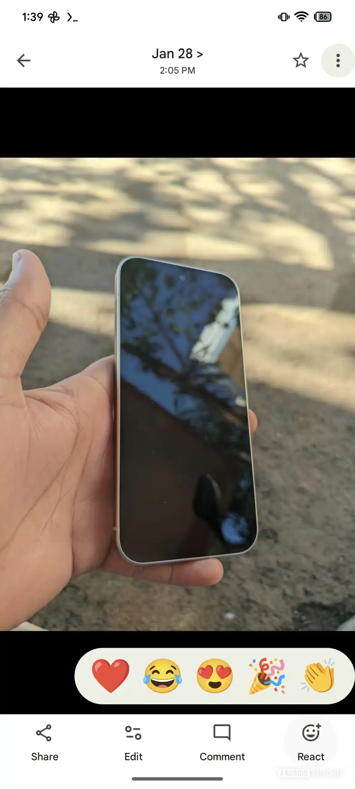 While digging into the version 7.40.0.790840830 of the app, Android Authority discovered a new emoji reaction bar for shared photos. Once you open the photo, you will now see a React button on the bottom bar, replacing the familiar heart icon. Tapping this button will present you with a small horizontal row of five emoji reactions. This includes red heart, laughing face, heart-eyes, party popper, and clapping hands.