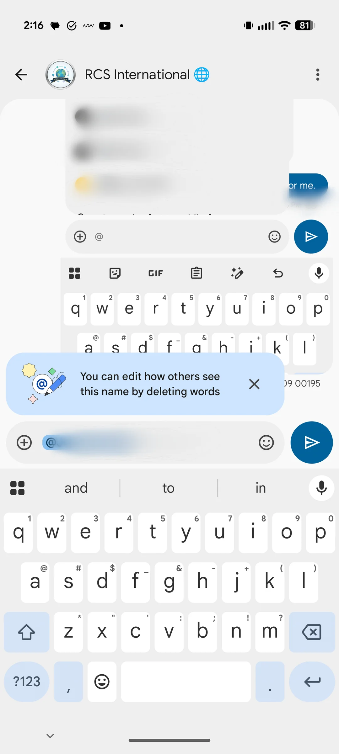 If you don’t want to reveal how you have saved the contact’s name, Google Messages lets you edit the display name before sending the message. For example, you can remove a last name or shorten the name so that it shows up differently to others in the chat. For contacts not saved in your phone, the @mention will display the phone number.