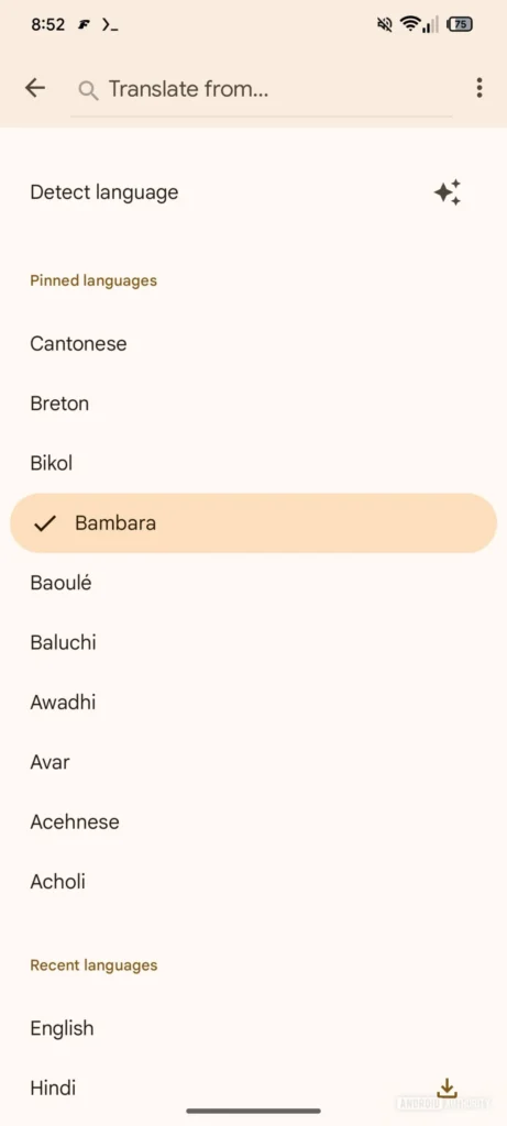 Android Authority found the clues while digging through Google Translate version 10.8.48.878519627.2-release. In it, Google appears to be testing a new “Pinned languages” section within the language selection page. At the moment, Google Translate shows a “Recent languages” section below the “Detect language” option.