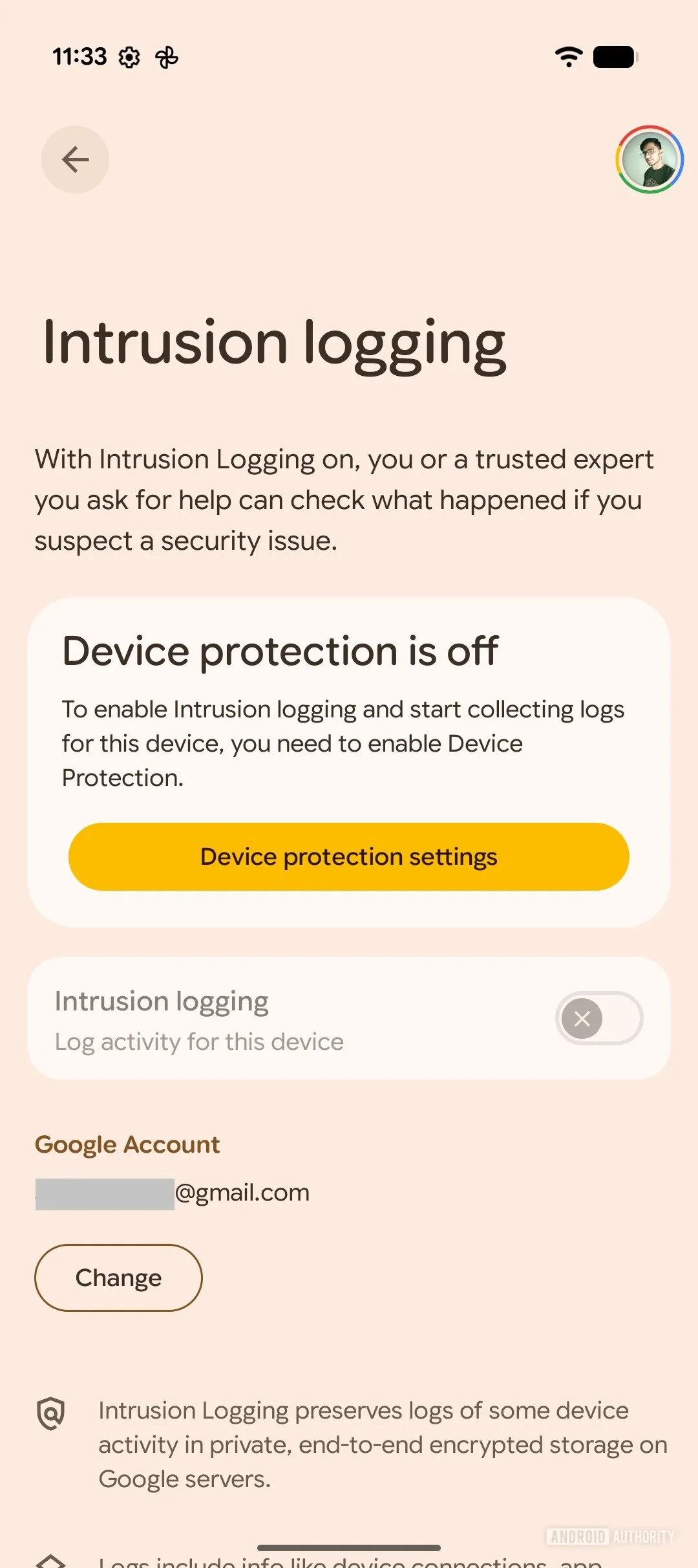 Folks over at Android Authority have reverse-engineered version 26.02.31 of Google Play Services to find details about Intrusion Logging. As you can see in the screenshots below, the Advanced Protection menu (in Settings) lists the Intrusion Logging option under Other features. The description reads “Preserve encrypted logs of some device activity in case of a security issue.”