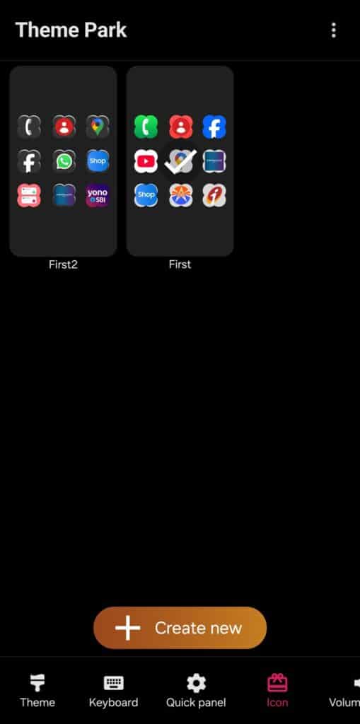 - To create a new icon pack, click Create new at the bottom. Read this guide on how to create and enable custom icon packs on Galaxy devices using Theme Park