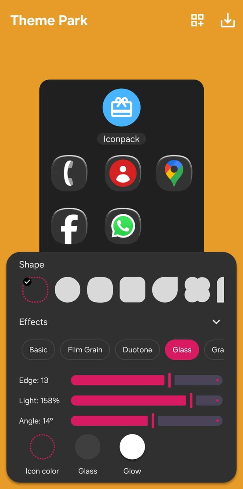 - Now, select the Glass effect and adjust the Edge, Light, and Angle sliders according to your liking. You can also customize the icon color, glass hue, and glow, with a real-time preview of your customizations