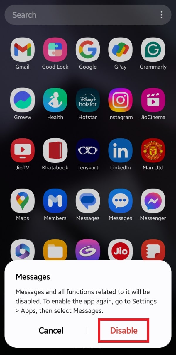 That’s it. You can now go back. Samsung Messages is your default messaging app. You may not be able to uninstall Google Messages but you can disable it. To do that, long press on the Google Messages icon on the app drawer and select the Disable button on the pop-up. If asked for confirmation, select Disable again. The app will disappear.