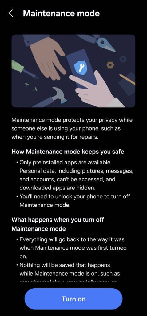 However, your accounts (Google, Samsung, email, etc.), photos, files, and messages, installed apps and their data, and sensitive system data are all hidden. Once Maintenance Mode is disabled, everything reverts back exactly as it was. Apps that technicians download and any other data they generate during repairs and testing are automatically deleted, giving you “your” phone.